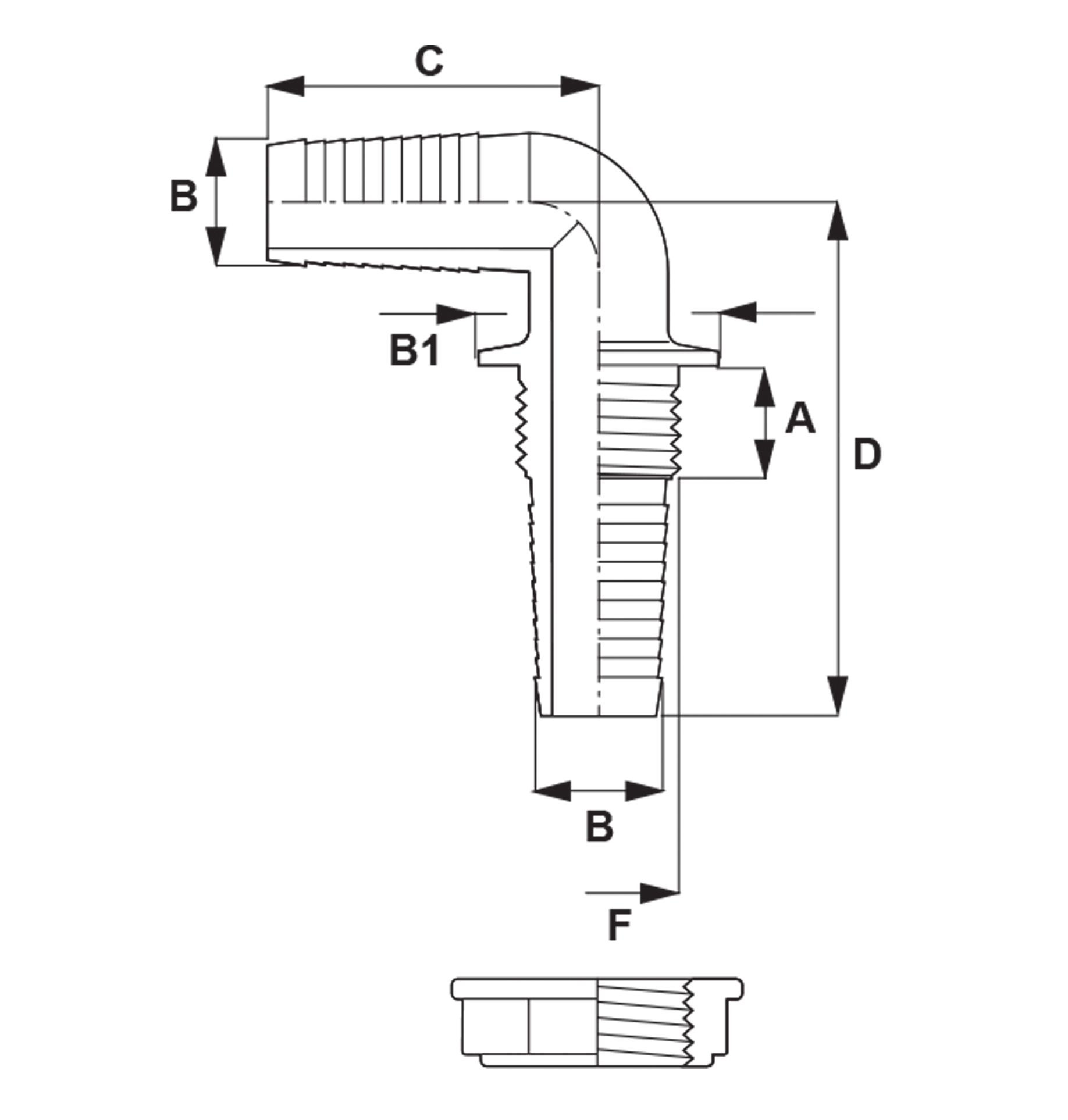RACORD PASAPARED DE UNA SOLA PIEZA, CURVO CON TUERCA